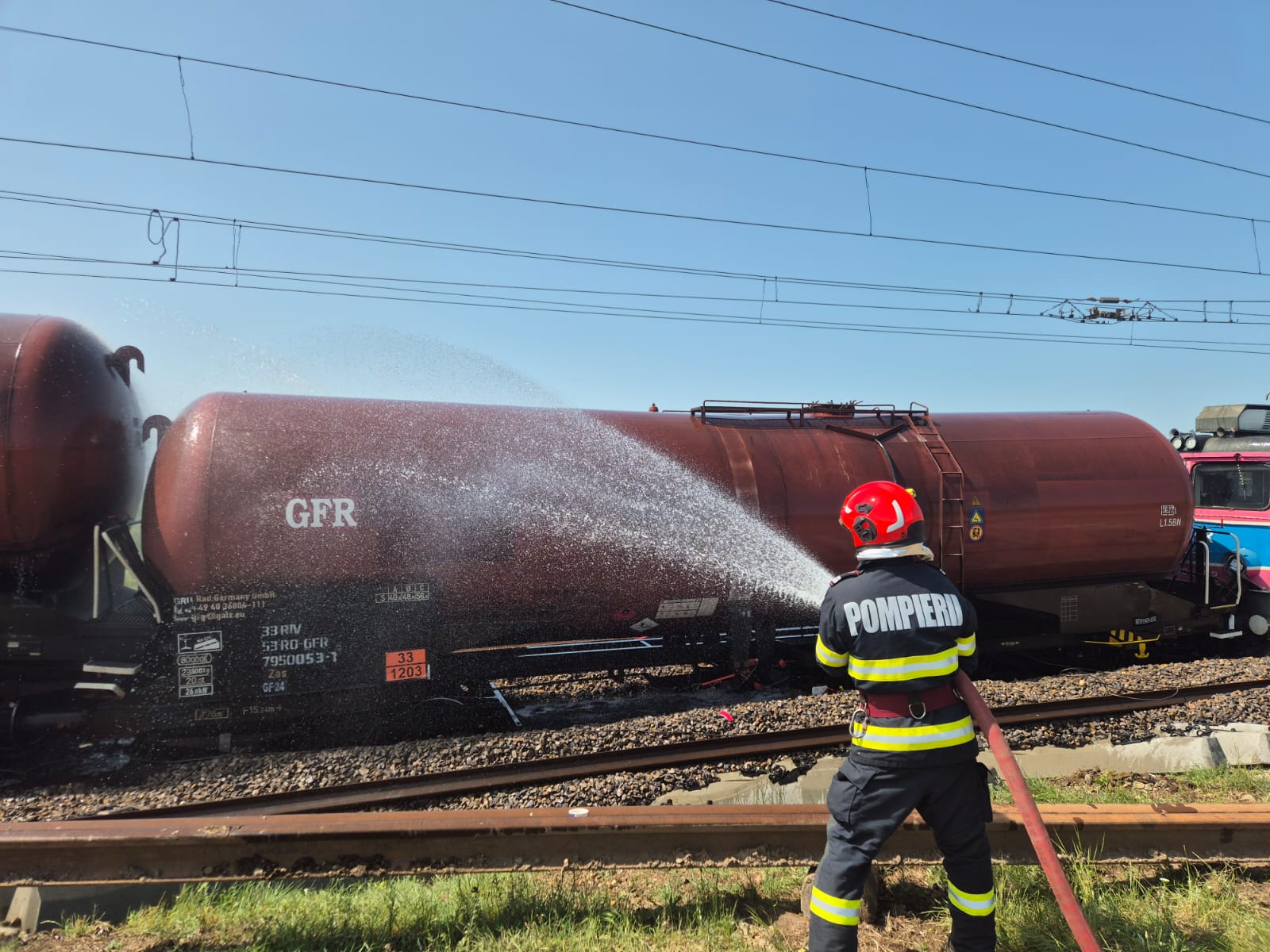 „La ora 13:48, cu ajutorul unei locomotive Diesel, aparţinând operatorului privat de transport feroviar (GFR) implicat în accident, au fost retrase din staţia CF Măldăeni (spre staţia CF Roşiori Nord), toate cele 33 de vagoane nederaiate din compunerea trenului. Pentru operaţiunea de transvazare, operatorul privat de transport feroviar GFR va folosi două vagoane cisternă şi echipamente necesare. Menţionăm faptul că, această operaţiune (transvazare) se poate realiza numai după ce ISU va permite accesul. De asemenea, după ce ISU va permite accesul, personalul feroviar al SRCF Craiova va acţiona…